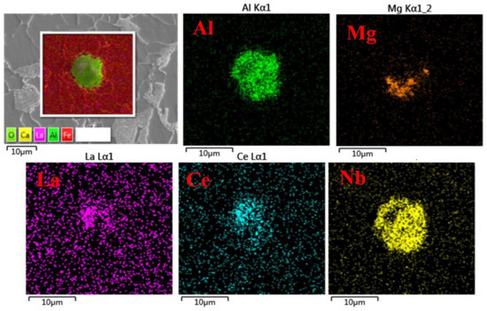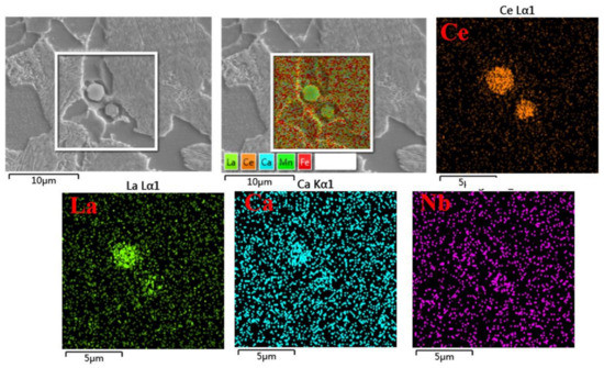 It could be seen that the quantity of RE inclusions from RH refining process is more than that from LF refining, due to the higher content of RE. The inclusions of RE all coexist together in the inclusions in the whole bulk of sample. The composition of the inclusions from RH process with RE addition is shown in Table 3. It was also found that there is no Nb precipitation in the inclusions, and the content of Al and Mg in the inclusions is also drastically reduced (Figure 5).