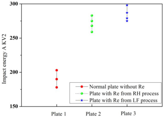 - RE has a positive effect on the toughness of the steel plate. The impact energy of the plate with RE is approximately 50 J higher than for a regular plate without RE. The toughness of the plate with RE from LF refining is better than that from RH refining.