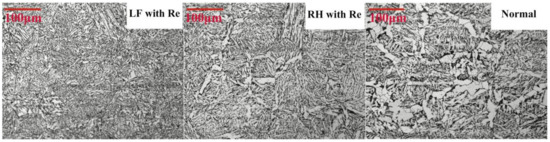 It can be seen from Figure 6 that the impact energy of the plate with RE is approximately 50 J more than the one without RE. The toughness of the plate with RE from LF process is slightly more than that from RH process. RE has a positive effect on the toughness of the plate. The product performance can meet the requirements of high-heat-input welding.
