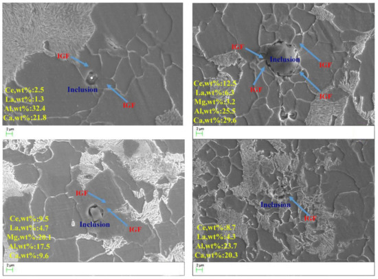 The grain sizes of the plate are 8.63 μm (LF with RE), 9.93 μm (RH with RE), and 10.32 μm (regular plate without RE). The refinement of grain size would increase the toughness of the plate. A conclusion can be drawn from Figure 7 that the plate from the LF process with RE at the coarse-grain area is the finest with a high heat input of 200 kJ/cm. It also can be seen that the grain size of a regular plate without RE is the largest during the high heat input welding. As for the toughness performance, the plate with RE from LF process is not very different to that from the RH process. However, the difference in the grain size is more substantial after the high heat input welding. All these reasons show that the RE inclusions could induce the intragranular ferrite to refine the grains to the preferred size (Figure 8). The number of inclusions in the selected format is more than that in RH process.