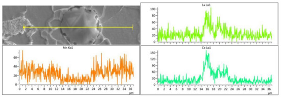 From Figure 9, it is possible to see that the inclusions of RE can induce the intragranular ferrite. The inclusions produced a depleted manganese zone, a depleted manganese zone would result in the formation of the intragranular ferrite. These inclusions of preferable size could induce the intragranular ferrite and refine the grain size. The intragranular ferrite that they influenced is not acicular, but quasi-polygonal. The ability to refine the grains of quasi-polygonal ferrite is weaker than that of acicular ferrite.