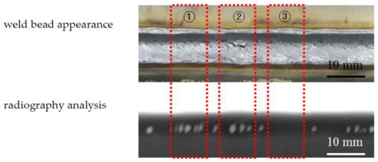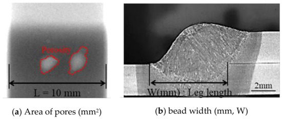 The number of pores with surface area exceeding 1 mm2 was measured via the external appearance analysis of the weld. The porosity of the welds was obtained by measuring the pore area via radiography analysis as shown in Figure 4 and substituting the parameters of weld bead shape into Equation (1).