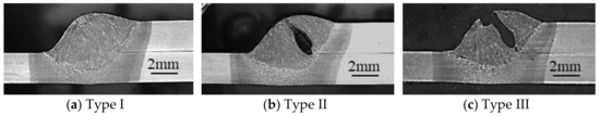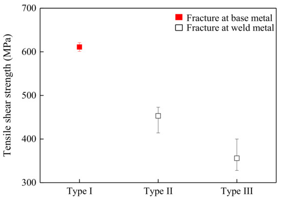As shown in Figure 6, the type I specimen shows good welds with no defects in the welds. In the type II specimen, pores were observed inside the welds. The type III specimen had surface pores owing to internal blowhole growth. Figure 7 shows the tensile shear strength, which is the applied load divided by the specimen cross-sectional area for the three types of weld specimens. The type I specimen had a tensile shear strength of 611 MPa with base material failure. The type II and III specimens showed tensile shear strengths of 453 MPa and 356 MPa, respectively and weld fracture occurred. Consequently, the presence of pore defects in the welds affected the tensile shear strength.