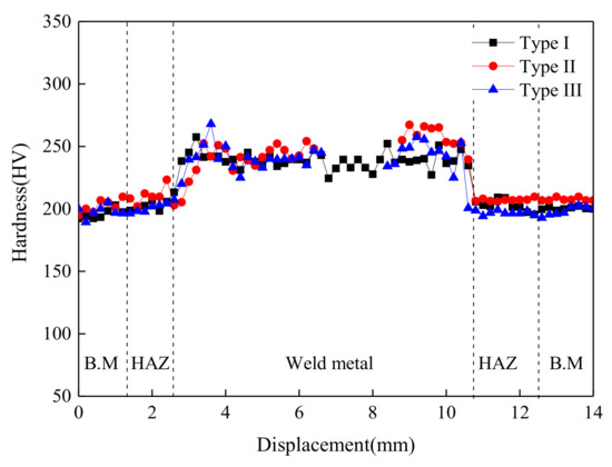 Figure 8 and Figure 9 show the measured hardness of the weld. The red line in Figure 8 indicates the position at which the microhardness of the weld specimen is measured. The hardness of the base material in the three types of specimens ranged from 197 to 200 HV and the hardness of the heat-affected zone (HAZ) was 200 to 205 HV on average. In the case of the type II and III specimens in Figure 9, the interval where the hardness value is zero in the middle represents the position of the pore. The mean hardness of the fusion zone was 237 to 245 HV and there was no significant difference for the different weld defect types.