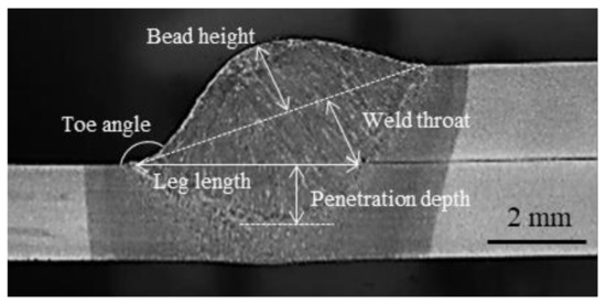 As Zn-coated steel sheets have excellent corrosion resistance, they are widely applied to automobile chassis and body parts. Chassis and body parts are mainly manufactured via arc welding with a lap fillet joint. In the case of Zn-coated steel sheet, Zn is vaporized using arc heat during arc welding with a lap fillet joint and is trapped in the weld, resulting in weld defects owing to pores [1,2]. If defects such as pores are generated in the weld, it is reported that the mechanical properties such as tensile strength are degraded [3]. Therefore, extensive research has been carried out to understand the cause of pore generation in the arc welding of Zn-coated steel sheet and to reduce the pores in the weld. Tatsui et al. [4] reported that vaporized Zn can easily escape from the molten pool to the outside if the molten pool is vibrated during the arc welding of galvanized steel sheets. Yuan et al. [5] applied a hybrid tandem metal active gas (MAG) process to a primer-coated steel plate to remove the Zn layer by sufficient penetration in the leading MAG and to form a sound weld in the trailing MAG. Using this hybrid tandem MAG process, the pores in the welds were reduced. Izutani et al. [6] developed a new welding wire and designed a pulsed waveform for the arc welding of galvanized steel sheets to reduce the pores in the weld.