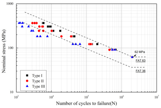 In this study, the welds of lap fillet joints were fatigued to two types: weld root and weld toe. In the IIW 2008 specification [23], there is a double lap fillet joint shape similar to the shape of the weld joint in this study. According to the IIW 2008 specification, FAT 36 was satisfied when weld root fracture occurred and FAT 63 was satisfied when weld toe fracture occurred. In this study, FAT 36 was satisfied when weld root fracture occurred in the type I and II specimens but FAT 36 was not satisfied in the type III specimen owing to weld defects. FAT 63 was satisfied when the nominal stress of fatigue failure at the weld toe was 92 MPa.
