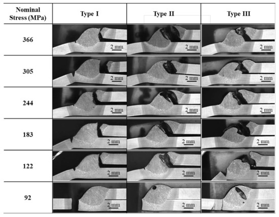 Figure 12 shows the stress versus number of cycles to failure (S–N) curve of each specimen according to the pore defects in the weld. When the nominal stress was 366 MPa, the fatigue lives of the type I, II and III specimens were 5799 cycles, 3322 cycles and 1337 cycles, respectively. The fatigue life decreased in the order of type I, type II and type III specimens. Even when the nominal stress was between 122 and 305 MPa, fatigue behavior similar to that of the fatigue test was obtained when the nominal stress was 366 MPa. Moreover, fatigue life was similar for each specimen type with the nominal stress of 92 MPa. The permanent fatigue limits satisfying the fatigue life of 2 × 106 cycles were the same with the nominal stress of 62 MPa for all the three types. When the fatigue stress was high, the fatigue life of each weld type was observed to be different. The fatigue life of each weld type showed no difference when the fatigue stress was decreased.