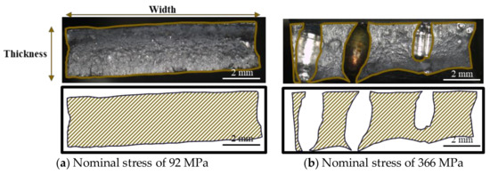 Figure 13 shows the fatigue fracture profile of the welds according to fatigue stress. In the case of nominal stress between 122 and 366 MPa, all three types of fatigue test specimens were broken at the root of the welds. In the case of nominal stress of 92 MPa, all three types of specimens showed fatigue fracture at the weld toe. Fatigue fracture propagates from the root to the top of the plate when fatigue cracking occurs at the root and when fatigue cracking occurs at the weld toe, the fatigue fracture propagates down to the weld toe of the bottom plate. Hwang et al. [11] reported that fatigue fracture propagated from the root to the top of the plate when fatigue cracks occurred at the root and fatigue crack propagated down to the weld toe of the bottom plate when fatigue cracks occurred at the weld toe. The applied load used for the measurement of static and fatigue strength can induce a very complicated distribution of normal and shear stresses in the lap joint [20,21,22]. In the fatigue tests of the lap fillet joint, a secondary bending moment is observed. At higher loads between 122 and 366 MPa, the effect of the secondary bending moment at the weld root increases. At lower loads below 92 MPa, the influence of the secondary bending moment becomes relatively smaller and the location of the stress concentration changes from the weld root to weld toe [7,11].
