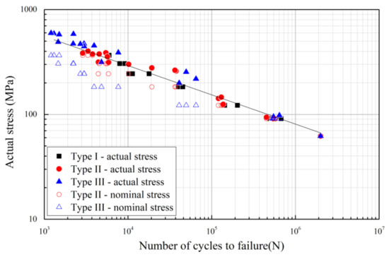 Figure 16 shows the S–N curve derived using the actual stress obtained from Equation (3). In the case of nominal stress of 92 MPa, even if it is converted to actual stress, no significant difference can be observed as shown in Figure 14 because there are only a few pore defects in the weld. However, at the nominal stress of 122 to 366 MPa, where fracture occurs at the weld root, the area of fatigue load is reduced owing to the pore defects in the weld, which increases the actual stress. In the high-fatigue-load region where fatigue fracture occurs at the weld root, defects such as porosity and surface pores reduce the sectional area under load and have a significant influence on fatigue life. However, in the region of fatigue load where fatigue fracture occurs at the weld toe, pore defects do not significantly affect fatigue life. Further, as shown in Figure 16, the S–N curves after conversion from nominal stress to actual stress for the type II and III specimens show that the actual stress values of these types are linearly correlated to the nominal stress values of the type I specimen. This indicates that, if the reduction of the contact area owing to pore defects is corrected by measuring the actual contact area, a similar fatigue strength result can be obtained as the fatigue strength in the absence of defects such as in the type I specimen. In other words, the fatigue strength is proportional to the contact area of the weld.