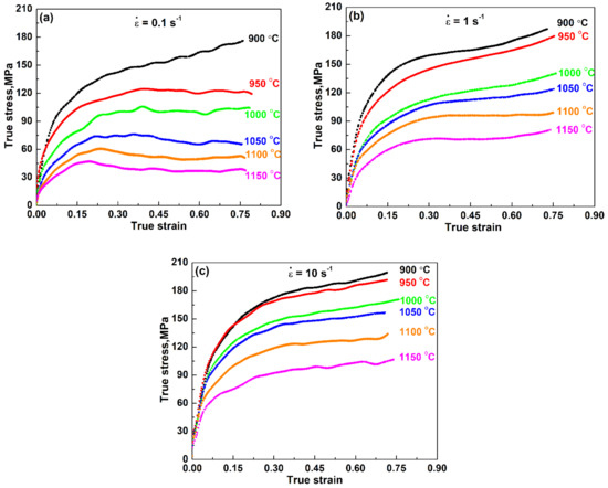 Figure 2. Typical flow curves of Ti-Mo steel obtained under various temperatures in the range of 900–1150 °C and strain rates of (a) 0.1 s−1, (b) 1 s−1 and (c) 10 s−1.