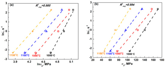 Figure 3. Plots of (a) ln ε ˙ vs. ln σ p and (b) ln ε ˙ vs. σ p at each deformation temperature of 1000–1150 °C for determining material constants, n1 and β.
