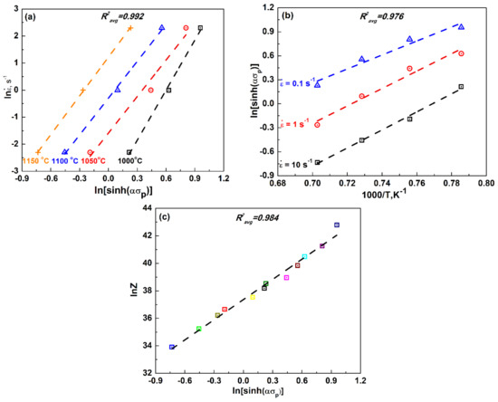 Figure 4. Plots of (a) ln[sinh( α σ p )] vs. 1000/T, (b) ln ε ˙ vs. ln[sinh( α σ p )] and (c) lnZ vs. ln[sinh( α σ p )] under different experimental conditions for the values of n, S and A.