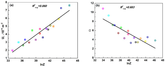 Meanwhile, several important parameters such as U, Ω and nA were utilized to compare the variations in hot deformation behavior of Ti-Mo steel as a function of the Z parameter. From Figure 7, the U value was found to exhibit an approximately positive linear relationship with lnZ (Figure 7a). An increase in the Z value corresponded to the larger strain rate or the lower deformation temperature, implying more effective work hardening. On the contrary, the Ω value dropped with increasing Z value (Figure 7b). Furthermore, the peak dislocation density (ρp) exhibited a similar tendency with the U (Figure 7c), due to the proportional relationship between these two parameters.
