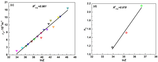Figure 7. The relationship between typical parameters for physical models and the Z parameter. (a) Hardening parameter, U; (b) softening parameter, Ω ; (c) Avrami’s parameter, nA; (d) peak dislocation density, ρ p .