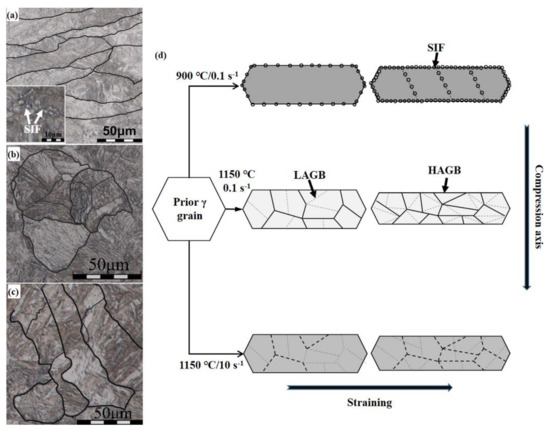 Figure 8. Microstructural evolution of a Ti-Mo microalloyed steel during hot compression at different temperatures and strain rates: (a) 900 °C/0.1 s−1, (b) 1150 °C/0.1 s−1 and (c) 1150 °C/10 s−1; as well as the corresponding schematic diagrams (d). LAGBs and HAGBs indicate the low/high angle grain boundaries. The background colors represent the low/high density of dislocations, respectively. SIF, strain-induced ferrite.