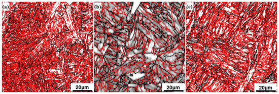 Figure 9. Electron backscattered diffraction (EBSD) maps of Ti-Mo microalloyed steel under different deformation conditions: (a) 900 °C/0.1 s−1, (b) 1150 °C/0.1 s−1 and (c) 1150 °C/10 s−1. The red and black solid lines represent the low-angle grain boundaries (LAGBs) of 2–15° and high-angle grain boundaries (HAGBs) of above 15°. The plane of EBSD observation was parallel to the compression axis.