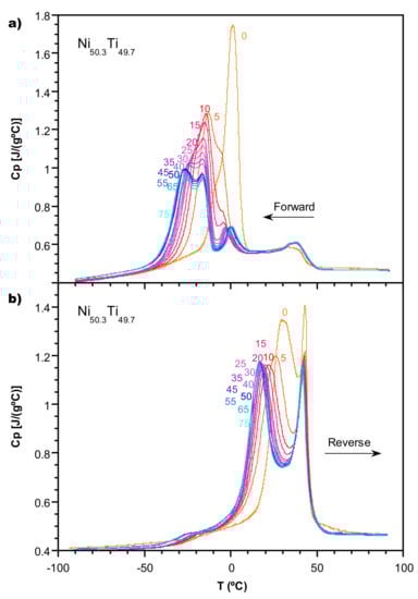 DSC measurements at 10 °C/min, which show the multistage martensitic transformation expected in aged polycrystalline TiNi samples, were performed. The evolution of the forward and reverse MTs multistep processes can be seen in Figure 1.