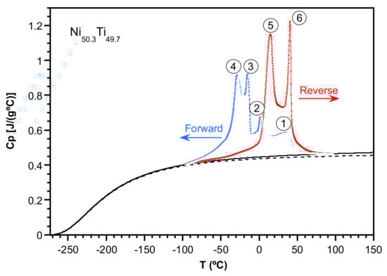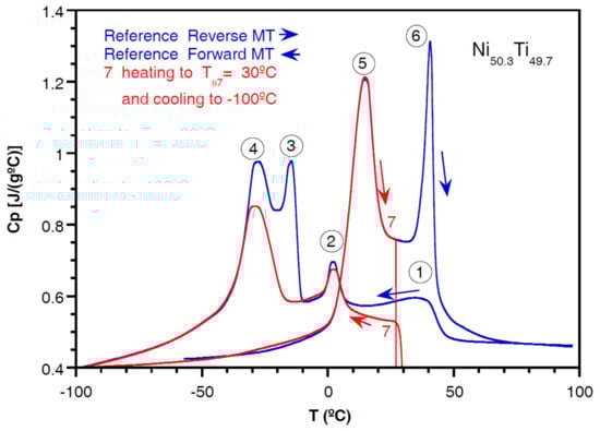 Partial cycling of Ni50.3Ti49.7 from −100 °C to 30 °C and then to −100 °C to complete the study of the multistage MT. The obtained Cp curve (red) is compared with the complete forward and reverse MTs between −100 °C and +100 °C (in blue).