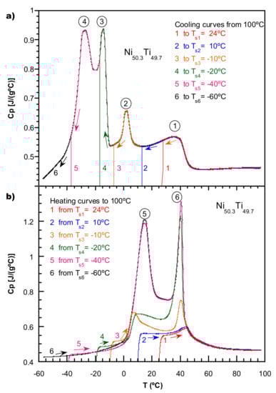 To establish the sequential process of the forward and reverse MTs, an attempt to obtain the correspondence among the various heating and cooling peaks was performed. For this purpose, the enthalpy contents of the various peaks observed upon cooling were compared with those detected upon heating. In order to study the transformation stages, several partial cooling-heating and heating-cooling experiments were performed. For the sake of clarity, as stated in Figure 2 and Table 1, the Cp peaks representing these stages are successively numbered from 1 to 4 with respect to cooling and are numbered 5 and 6 with respect to heating, as shown in Figure 3 and Figure 4. The calorimetric experiments consisted of successive partial cooling runs (Figure 3a) from 100 °C to a variable stop temperature (Ts), followed by the corresponding heating runs (Figure 3b) from Ts back to 100 °C. As can be seen in Figure 3, the selected Ts values were 24, 10, −10, −20, −40, and −60 °C, respectively. The vertical lines appearing in the DSC signals are only to indicate the experimental stopping process and, though with no physical meaning, are maintained in the plot as approximate references for Ts. These temperatures were selected to analyze each individual cooling transformation stage by means of partial forward MT. It has been observed that: