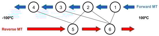In this experiment, the sample has been heated from −100 °C to a selected intermediate temperature between peaks 5 and 6: Ts7 = 30 °C. The subsequent cooling trace down to −100 °C presents peak 2 and peak 4, but stage 3 is absent. This confirms that stage 5 is only related to stages 2 and 4, but not to stages 1 and 3. These results are consistent with the reference forward MT obtained by cooling from 100 °C to −100 °C. Within this scheme, calculations of the peak areas lead to the corresponding enthalpy assignment to the various stages, the values of which are shown in Table 1. In addition, the relationships among the various MT stages are summarized in Figure 5.