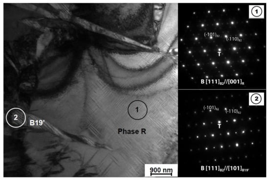 The microscopic description of the multistage MT together with the identification of the different phases have already been studied in previous works [,,]. Very similar complex phase sequences, close to the one presented here, have been found in the works by G. Fan et al. [] and B. Karbakhsh Ravari et al. [,]. In the latter study, up to a four-step transformation process was found in the forward MT of the samples after very similar thermal treatments, involving the same annealing temperature and time (950 °C, 1 h) and aging pattern (500 °C, 1 h), but no systematic thermal cycling seems to have been performed. However, their samples present a 50.6% Ni content, higher than that in our samples (50.3%), which would favor the Ni4Ti3 precipitation and, therefore, the presence of a heterogeneous nucleation. As we have described above, those authors also propose diverse relationships among the observed forward and reverse DSC peaks, but their results are somewhat different. In some cases [,], they have identified the various low-temperature phases (R and B19′ martensites) by means of in situ TEM measurements. As the phase sequences are extremely dependent on multiple physical parameters (mainly the composition and the thermomechanical history) these results cannot be confidently applied to our samples. In order to avoid these ambiguities, we have performed preliminary in situ TEM experiments in our quenched samples. Both the R and B19′ phases were identified, but it should be noted that the former is also found at very low temperatures well below the expected temperatures, as can be seen in Figure 6. The typical R phase spots at 1/3 <111> B2 positions were observed in the microdiffraction pattern acquired in the zone marked with circle 1, and spots occurring at 1/2 of the <110> B2 reflections characteristic of the B19′ martensite were clearly observed for the pattern acquired in the zone marked with circle 2.