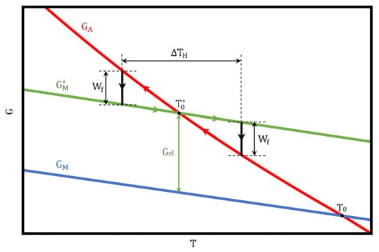 As reported in previous works [,,,], the presence of a highly heterogeneous microstructure makes the martensitic plates’ nucleation highly dependent on the different environments in the austenitic frame. Up to now, some of these locations have been identified [,,,], and among them are the grain boundaries, grain interiors, defects, and some other parts of the austenitic crystal, which hinder the transformation. As this affects both the martensitic B19′ and R phases, it can explain a wide variety of thermal hysteresis values and, consequently, the presence of the multiple and highly overlapped specific heat peaks. In this context, the observed thermal hysteresis should not be considered as an intrinsic property, fixed for each structural transformation. To analyze this problem, we can resort to the study of the Gibbs energy determined from the specific heat data together with the temperatures of transformation, which allow us to estimate the values associated with the elastic contribution and the dissipative works. As shown in previous studies [], the intrinsic Gibbs energy (sometimes called the “chemical Gibbs energy”), as a function of temperature, corresponding both to the austenitic phase (GA) and to the low-temperature martensitic state (GM) well below the transformation temperature range, is directly obtained from the enthalpy and entropy of the crystal lattice. For this purpose, the general relation G = H − TS can be used, together with the total enthalpy (ΔHT) and entropy (ΔST) changes associated with the complete transformation. Within this frame, the true thermodynamic equilibrium temperature (T0) between phases must be established by the GA = GM condition. However, the peculiarities of the plates’ nucleation in these alloys do not permit such a simple description. The difficulties for nucleation, which arise mainly from the crystallographic distortion of the crystal lattice during the transformation from the high-temperature cubic phase to the less symmetric low-temperature phases, lead to an elastic deformation of the variants [,]. This fact alters the effective value of the Gibbs energy in the martensitic phases, which can be now written as = GM + Gel. So, the actual phase equilibrium temperature () for every individual plate must satisfy the condition: = GA. As the values for Gel are different for the various single plates, so are their local equilibrium temperatures, providing a satisfactory description of the usual spread of the first-order martensitic transformations into a wide temperature range. That means that the distribution of the Gel among the plates explains the sequential character of these transformations, whereas, as cited above, Wf remains responsible for the observed ΔTH. For the sake of clarity, Figure 7 offers a schematic drawing to show the role of the quantities involved in the transformation of each plate.