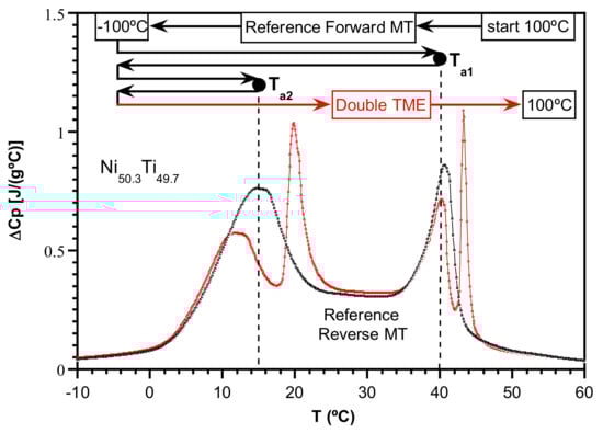 The experiments were started at 100 °C to guarantee that any previous TME is previously erased. The arrested temperatures were Ta1 = 40 °C and Ta2 = 15 °C close to the 6 and 5 peak temperatures, respectively. We note that the second partial heating up to Ta2 does not eliminate the first effect associated with Ta1, as Ta1 > Ta2 [,]. The final heating run undoubtedly shows the characteristic Cp peak split and confirms the presence of a clear TME in both stages. In the same figure, the Cp reference curve and the one showing the TME are plotted. Both the additional Cp peaks and the associated delay of the MT to higher temperatures are significantly larger in these TiNi alloys when compared, for example, with those observed in CuAlNi [].