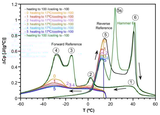In Figure 10, the final complete MT heating traces for “Hammer n” (n = 1–6 and n = 20) around stage 5 are presented. As defined above, each “Hammer n” curve represents the complete reverse MT after n previous partial cycles. The progressive increase of the secondary peak on stage 5 (5 s) is evident from these results, whereas stage 6 remains practically unchanged. The enthalpy decrease below Ta, is found to match the corresponding increase of the secondary peak (5 s). An example of the evolution of the ΔCp below Ta in the 20 previous partial cycles, before the “Hammer 20” curve, is shown in Figure 11.