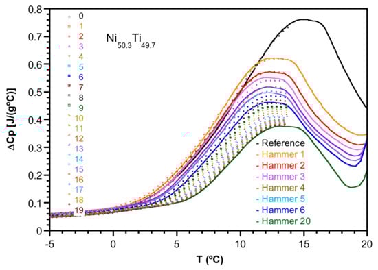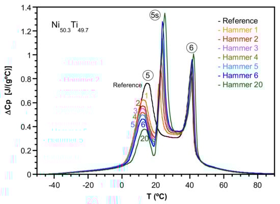 The repetition of the partial reverse MT from the martensitic state to the same arrested temperature Ta, is found to increase the TME [,]. To characterize this effect (the so-called “hammer” effect), we have focused only on stage 5 and selected Ta = 17 °C. After cooling from the austenitic phase, the partial sequence (ps): −100 °C → 17 °C → −100 °C is repeated n times (ps = 0, 1, 2…, n−1). Then, a complete reverse MT: −100 °C → 100 °C is made, and this last result is called the “Hammer n” curve. Independent experiments for n = 1 to n = 6 and n = 20 were performed. An example of these experiments for n = 6 is presented in Figure 9, where the various heating and cooling Cp curves are depicted after subtracting the calculated baseline. The reference cooling and heating curves (those which do not exhibit TME) are also plotted for comparison. The progressive delay of the MT is clearly shown by the ps heating curves 0–5 below Ta when compared with the reference curve. This means that at Ta the remaining martensite phase fraction is increased with cycles. Accordingly, the corresponding cooling curves also confirm this fact, as the area below the peaks clearly diminish after each cycle. It should be noted that only peaks 2 and 4 show this effect, but, as expected, peak 3 does not, being not present in all these cooling curves. This result again confirms that stage 5, upon heating, is only related to stages 2 and 4 on cooling as discussed before (see Figure 5 and Table 1). After the multiple partial cycling, the final complete MT shows the “hammer 6” TME curve with a high increase of the secondary peak (5 s) when compared with the single TME (n = 1), as seen in Figure 9. We finally note that, once the TME has been erased, the last cooling curve corresponding to the complete forward MT fits quite well the initial “reference” curve.