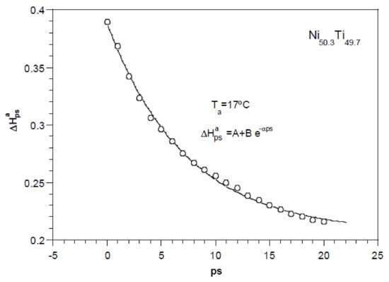As can be seen in Figure 12, an almost exponential decrease in this quantity is observed as a function of ps. The delay of the transformation approaches 50% of the initial value for n > 20. In previous works, similar results were explained by the progressive redistribution of the elastic energy among the martensitic plates by means of a simple relaxation model [,]. However, the complexity of the multistage transformation in these TiNi polycrystalline samples does not permit such an approach.