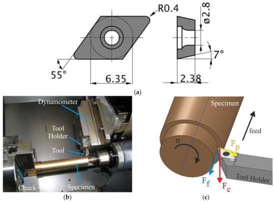 (a) Cemented carbide-cutting insert geometry (in mm) []; (b) set-up for the measurement of the cutting forces; and (c) machining kinematics and the cutting-force components that were measured in all experiments.