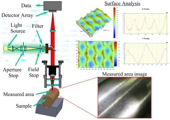 Figure 3 illustrates the principle of 3D white-light interferometry for surface roughness measurement, which was adopted as the most adequate technique for the scope of the current research. The surface analysis results comprise the 3D topographical map and 2D cross-sections, which show both the shape and the resulting roughness. Furthermore, all tribological data according to the ASME-ANSI B46.1 standard were calculated. As mentioned above, two repetitions were also exploited for each set of the selected cutting parameters and the average roughness value was deduced.