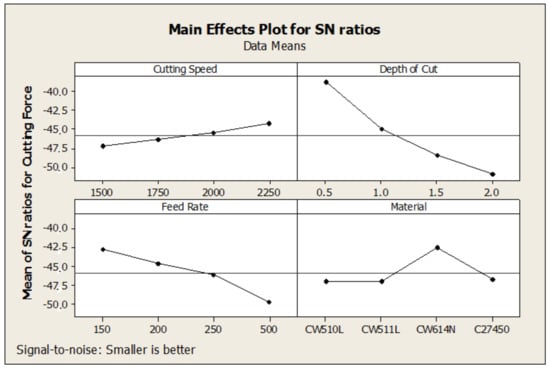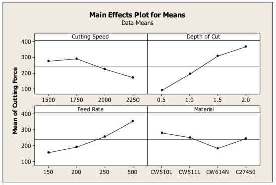 The plots of main effects of S/N ratios (Figure 7) and data means (Figure 8) indicated that the optimum values of cutting parameters that minimize the cutting force were the following: