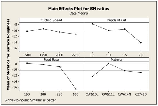 Diagrams showing the variation of S/N ratios for surface roughness as a function of the cutting parameters (cutting speed, depth of cut, feed rate and material).