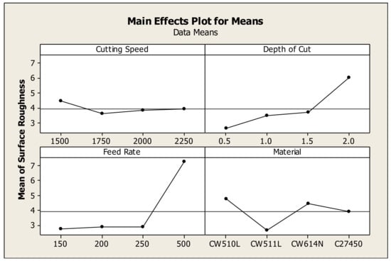 Diagrams showing the data means for surface roughness as a function of the cutting parameters (cutting speed, depth of cut, feed rate and material).