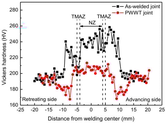The hardness distributions along the weld cross-section centerline of the as-welded and PWHT joints are shown in Figure 2. In the as-welded joint, the hardness of the NZ is approximately 250 HV, which is much higher than that of the BM (190 HV). In addition, the hardness of HAZ also increases obviously, which should be related to the plastic deformation that occurred in the HAZ. After PWHT, the hardness of the NZ decreases and almost reaches the BM level, which is due to the grain growth in this zone. Besides that, due to the AGG during PWHT in the HAZ, two softened zones appear in the FSW joint. In addition, the width of the softened zones in the PWHT joint is wider than the hardened regions in the as-welded joint.
