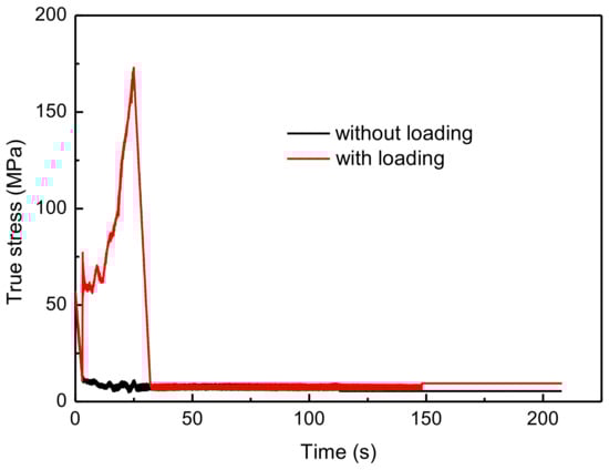 Figure 4 shows the variation of the axial stresses of the thermal cycle simulated specimen with time under two load modes. The stress of the thermal simulated specimen without additional load is almost unchanged, which is always approximately 10 MPa. In this condition, the specimen is only affected by the thermal cycle. However, during the heating stage of the thermal simulated specimen with additional load, “stroke” was selected as the control mode of compression anvils with a constant displacement of 0 mm. The specimen expands due to the increase in temperature. However, the fixation of the compression anvils’ position actually limits the expansion of the thermal simulated specimen. It is equivalent to a compressive load for the specimen. Therefore, as shown in Figure 4, with the increase in temperature, the stress of the specimen with additional load increases significantly. It reaches approximately 175 MPa. In this condition, the specimen is affected by the effects of the thermal cycle and additional load.