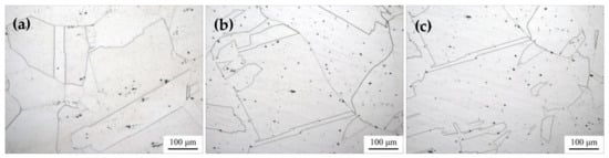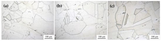 Figure 7 shows the microstructure of the thermal simulated specimens with additional load after heat treatment. First of all, it is similar to the thermal simulated specimens without additional load. After heat treatment, AGG also occurred in all specimens at three different peak temperatures. Second, compared with the thermal simulated specimens without additional load (by comparing Figure 6 and Figure 7), the grains in the specimens with slight strain are much coarser after subsequent heat treatment. Therefore, this finding proves that, although the additional load is not a necessary factor to induce AGG, it can promote the degree of grain growth in PWHT.