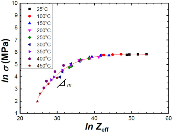 Zeff for the 5182 alloy for a temperature range between 25 and 450 °C at a given strain of 0.1. The