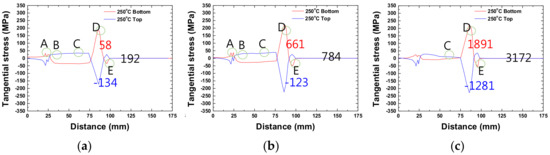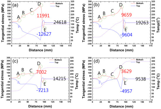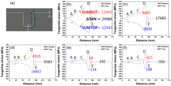 Figure 6a), the sign of tangential stresses reversed due to the bending changes in the opposite direction. As temperature was increased, the magnitude of tangential stresses throughout the tooling region decreased because the higher temperatures led to lower flow stress and, therefore, decreasing bending moments. The magnitudes of the tangential stresses, however, decreased more rapidly in the BC region (where both bending and unbending were expected to occur) compared to the other regions. The sign of the tangential stress of the top and bottom layers eventually reversed at temperatures above 250 °C; the stress state changed from tension to compression at the bottom layer and compression to tension at the top layer of the blank. This could occur when the magnitude of the bending moment in the BC region decreased faster than the magnitude of the unbending moment as temperature increased.