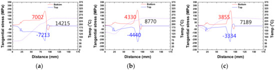 The tangential stresses at the top and bottom layers of the blank section were integrated from the center of the blank to the flange end and were named SUMTOP and SUMBOT, respectively; their values are given in the figures. ΔTAN is defined as ΔTAN = SUMBOT − SUMTOP, and their values are also given in the figures. With increasing temperature, SUMBOT changed from 12,443 to −421, whereas SUMTOP changed from −12,543 to 288. As a result, ΔTAN decreased with increasing temperature. The importance of ΔTAN in springback will be examined in the Discussion section.