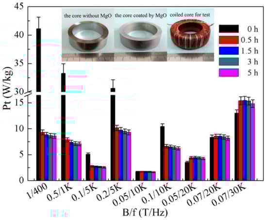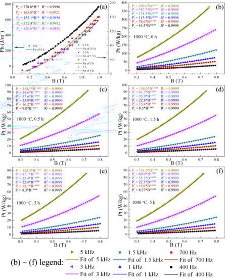 Figure 3 depicts the results of the hysteresis loss curves and the AC iron loss curves. It is well known that the Steinmetz law [9] is used to describe the relationship between Phys (hysteresis loss) and Bm (maximum magnetic induction), wherein: at DC field, where, kh is the hysteresis loss coefficient, and n is the exponent of Bm, which is always near 1.6. The different color formulas in the Figure 3a represent the fitting results of DC iron loss for different heat treatment time. R2 is the goodness of fit and the closer the value is to 1, the better the fit is. From Figure 3a, the DC iron losses decrease drastically after heat treatment and tend to decrease with the extension of the duration of heat treatment, and the coefficients of the fitted results (“kh” values) also have such a tendency. Generally, the “kh” value is affected by the kind of material, thickness, stress, grain size, etc. Any factor that reduces the resistance of magnetic domain motion can reduce the “kh” value.