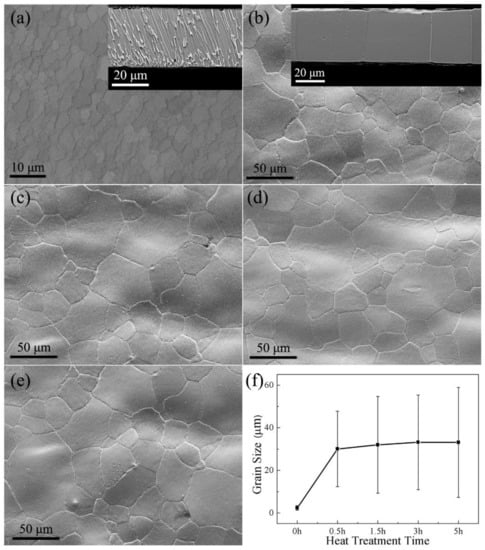 Free surface microstructure of Fe-6.5 wt. % Si ribbons (a) in the absence of heat treatment; (b) 1000 °C, 0.5 h; (c) 1000 °C, 1.5 h; (d) 1000 °C, 3 h; (e) 1000 °C, 5 h. (f) Grain size statistics.