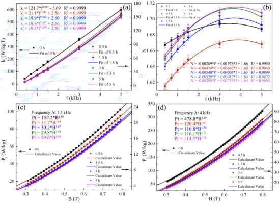 (a) AC iron loss coefficient kt and fit results; (b) AC iron loss factor N and fit results. The iron loss test result and calculation value at (c) 1.3 kHz frequency and (d) 4 kHz frequency. (a,c,d) have two y axes: the left vertical axe represents results before heat treatment and the right vertical axe represents results after heat treatment with different duration.
