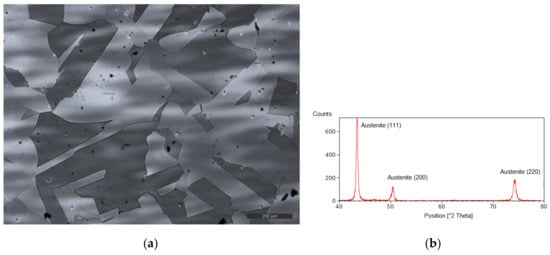 The chemical composition of the steel is shown in Table 1. Figure 1a shows the initial microstructure before tensile test, consisting of equiaxed austenitic grains. Annealing twins can also be observed. Cementite was not observed, and it is corroborated via X-ray measurements (Figure 1b) due to the absence of peaks corresponding to cementite.