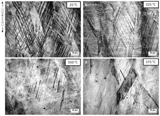 Figure 2 corresponds to the microstructures of samples at 25, 325, 350, and 375 °C, respectively (300 and 400 °C were not included because of their similitudes with 325 and 375 °C, respectively). A clear change in the response of the etching to the microstructure is noticed as the testing temperature is increased. At 25 °C (Figure 2a), it is observed that mechanical twinning is the predominating feature in the microstructure. Twins are also observed at 325 °C (Figure 2b), yet it becomes less frequent in the microstructure at 350 °C (Figure 2c). At 375 °C, twins are only observed in some scattered grains, while dislocation bands (black arrow in Figure 2d) are revealed.