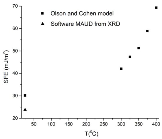 Figure 3 shows the calculated stacking fault energy as described in Section 2. Both SFE values at 25 °C, calculated from the model by Olson and Cohen and with MAUD, are in reasonable agreement. They are within the theoretical range of twinning deformation [].