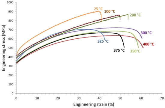 Discontinuous serrated curves were measured at 25 °C, 100 °C, and 200 °C (cf. Figure 5). Previous studies [] have related the serrations to the presence of dynamic strain aging, also known as the Portevin–Le Chatelier effect. Serrations were not observed above 300 °C. Necking was only noticeable in samples tested at temperatures above 325 °C, as can be seen in Figure 6. Below 325 °C, localized strain was not significant (cf. Table 2).