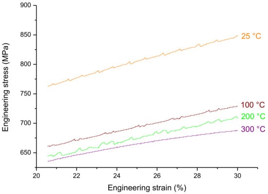 Stress–strain curves of tensile tests at different temperatures between 20% and 30% engineering strain.