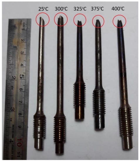 Tensile specimens at different temperatures. Red circles indicate the fractured zone.